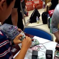 ルーレット回路を製作しているIくん。不要になった電解コンデンサをバイパスコンデンサ(パスコン)として再利用し、回路に組み込みました。柔軟な発想で、いらない部品を有効に活用することができましたね。